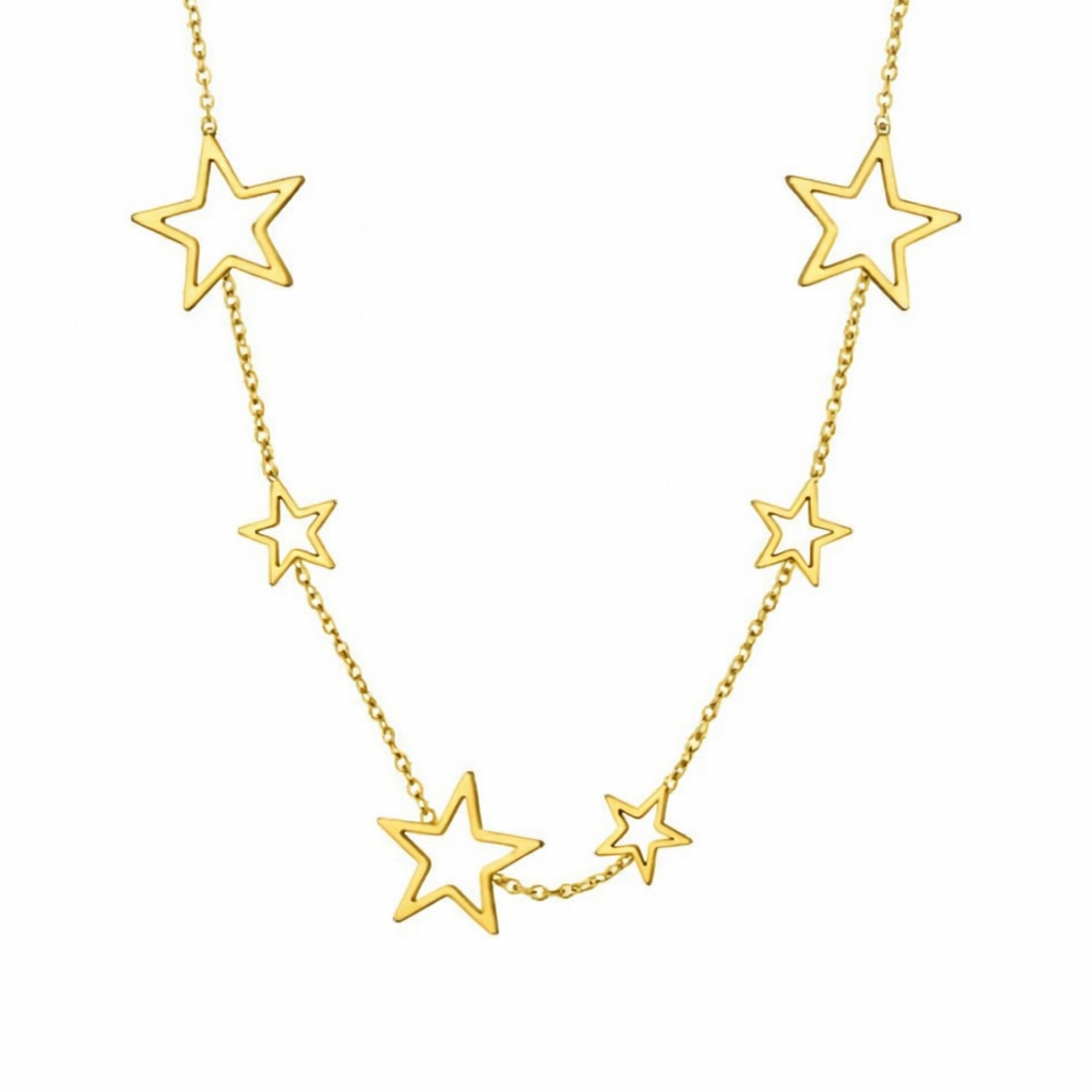 Add a touch of celestial magic to your everyday style with this 18K gold plated stainless steel star charm necklace. Designed with a delicate chain and open star pendants in varying sizes, this dainty choker brings effortless shine whether worn alone or layered with your favorite pieces.