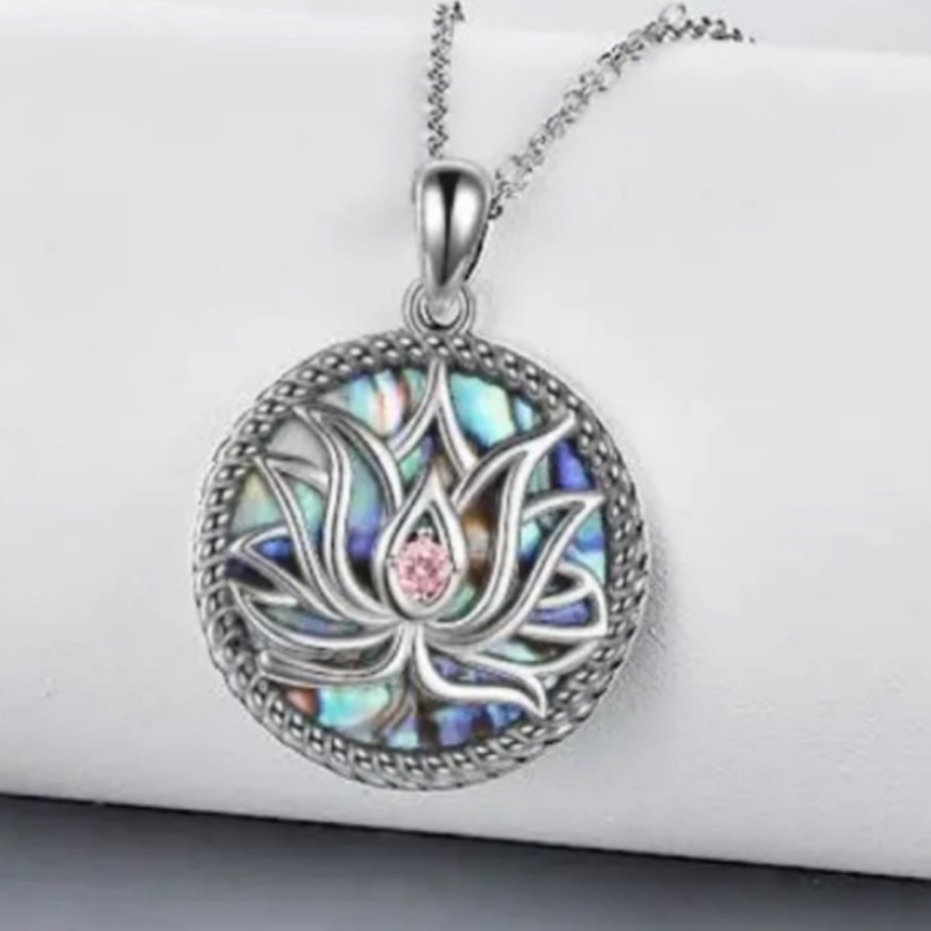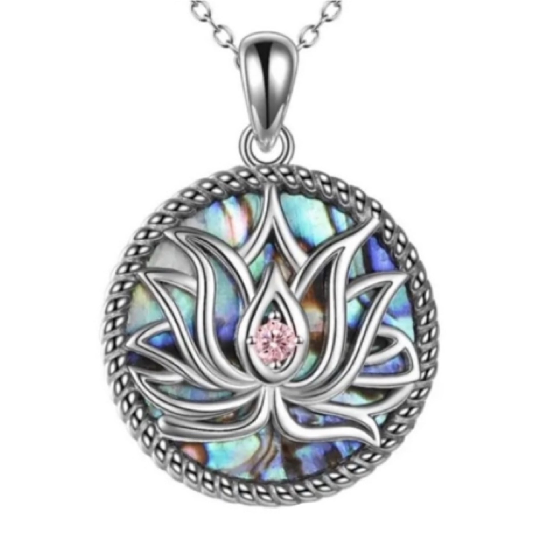 Beautifully crafted hypoallergenic stainless steel necklace with a lotus flower pendant set over shimmering abalone shell and accented by a pink cubic zirconia center. Measuring 1” x 1” on an 18-inch chain, it combines durability, comfort, and timeless elegance.