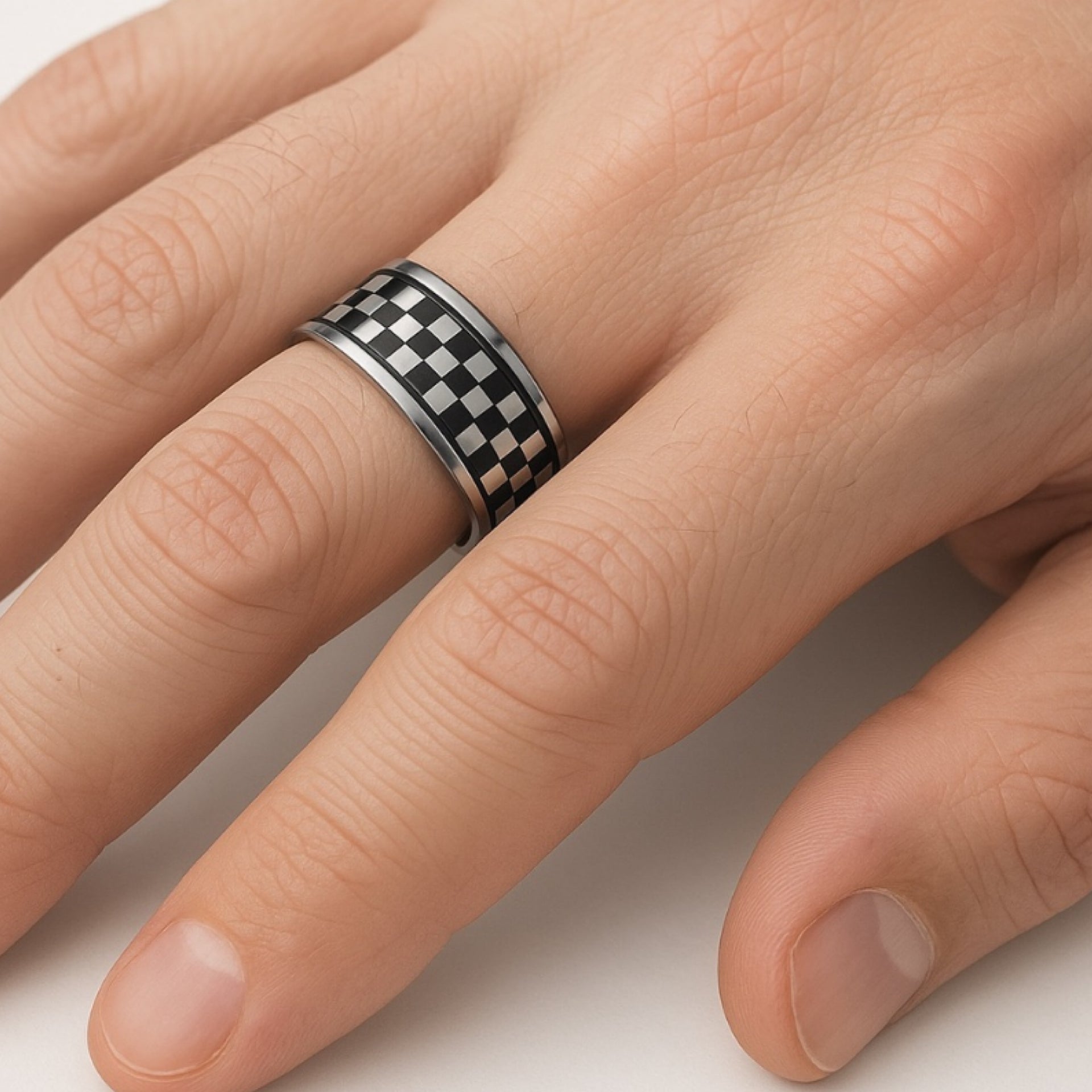 Sleek stainless steel band ring with black and silver checkerboard inlay. Durable, tarnish-resistant, and lightweight. Perfect for everyday wear, punk, goth, skate, Y2K, and streetwear styling.