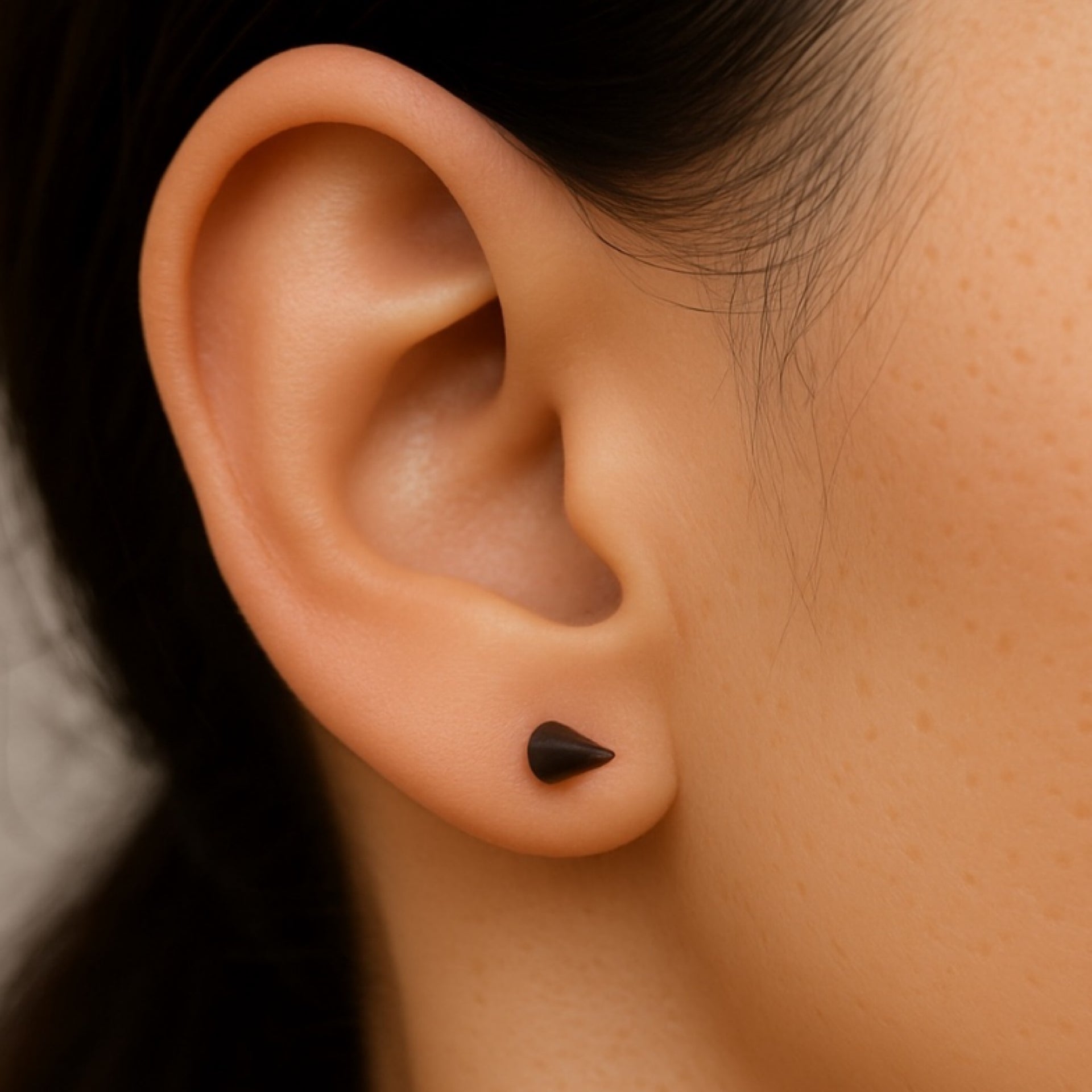 Minimalist black spike barbell earring crafted in durable 16G surgical steel. Measures 7mm long with 3mm cone tips. Fits multiple piercings including ear lobe, inner lobe, transverse lobe, tragus, anti-tragus, and outer conch. Lightweight, secure, and perfect for edgy everyday styling or curated ear stacks.