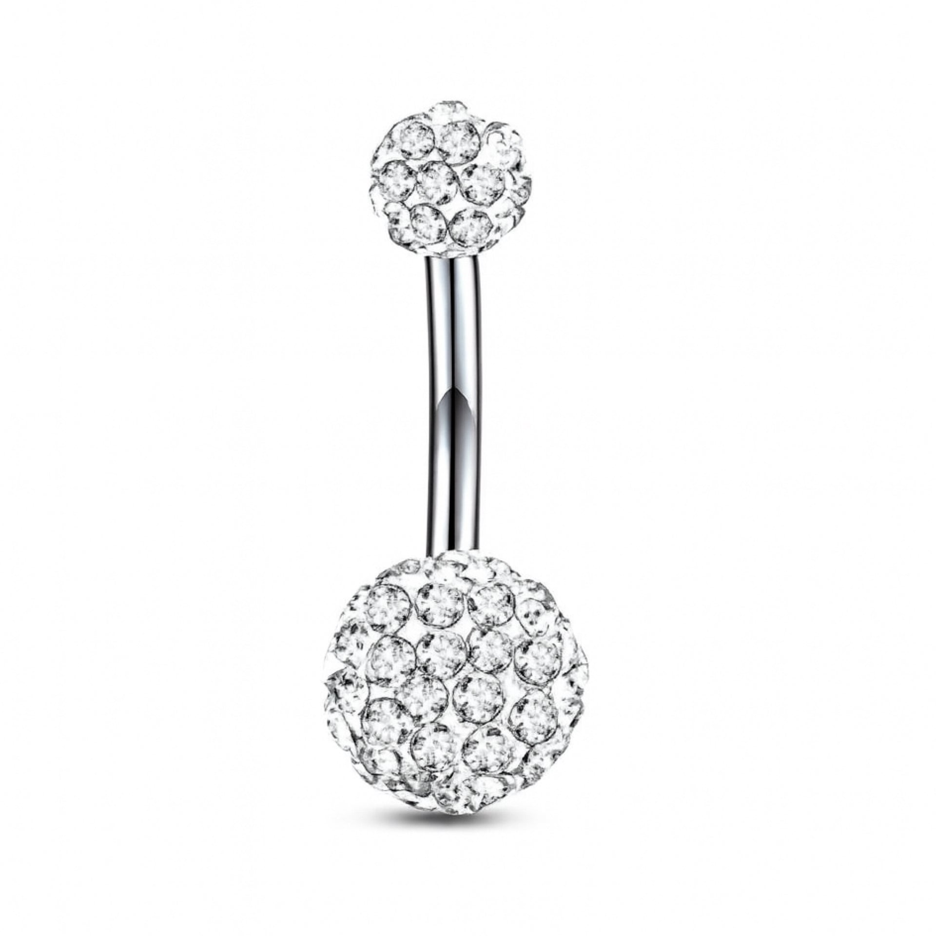 Sparkling 14G belly button ring with double crystal pave balls on a curved barbell. Hypoallergenic stainless steel, secure screw top design, and comfortable fit. Perfect navel piercing jewelry for everyday wear or special occasions.