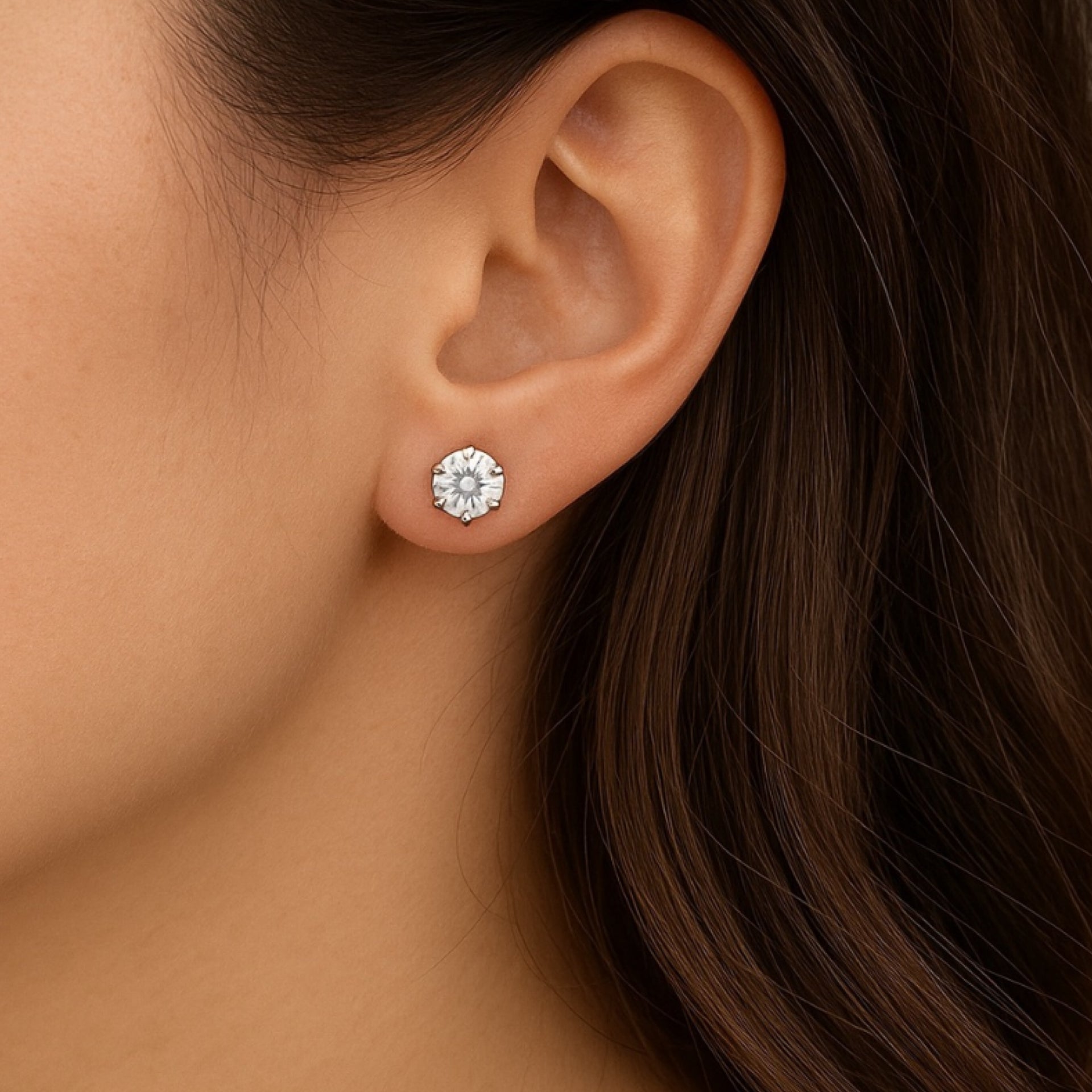 Stainless steel stud earrings featuring clear 6mm round-cut cubic zirconia in classic setting. Durable, tarnish-resistant, and hypoallergenic—perfect minimalist studs for everyday wear, layering, or curated ear stacks. Timeless sparkle for casual, work, or night-out style.