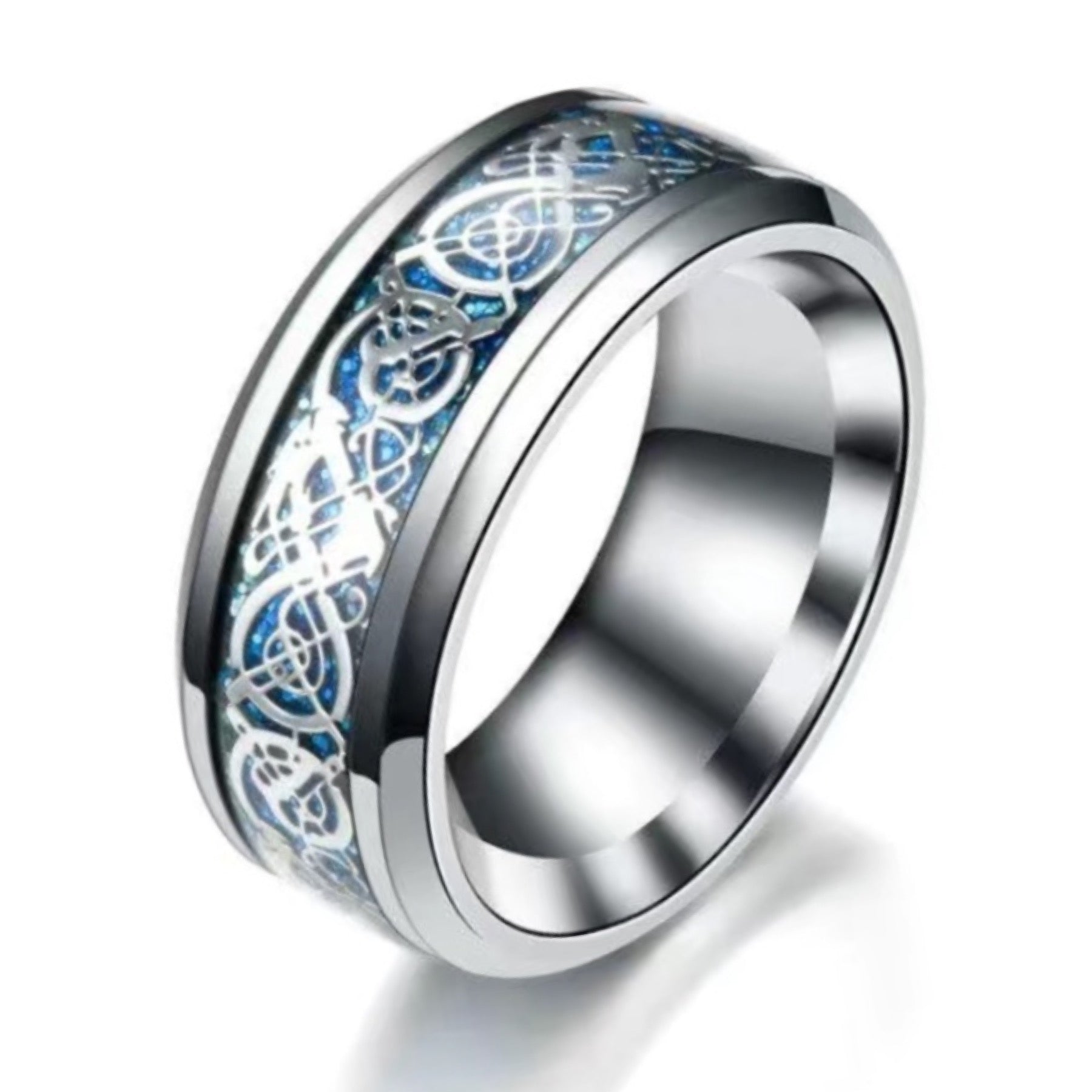 Bold men’s Celtic knot ring crafted in durable stainless steel with a striking blue inlay design. 8mm comfort fit band perfect as a wedding ring, promise ring, or everyday statement piece. Unique Viking/Norse inspired knotwork detailing adds timeless symbolism of strength and unity. Scratch-resistant, polished finish, hypoallergenic, and built for long-lasting wear.