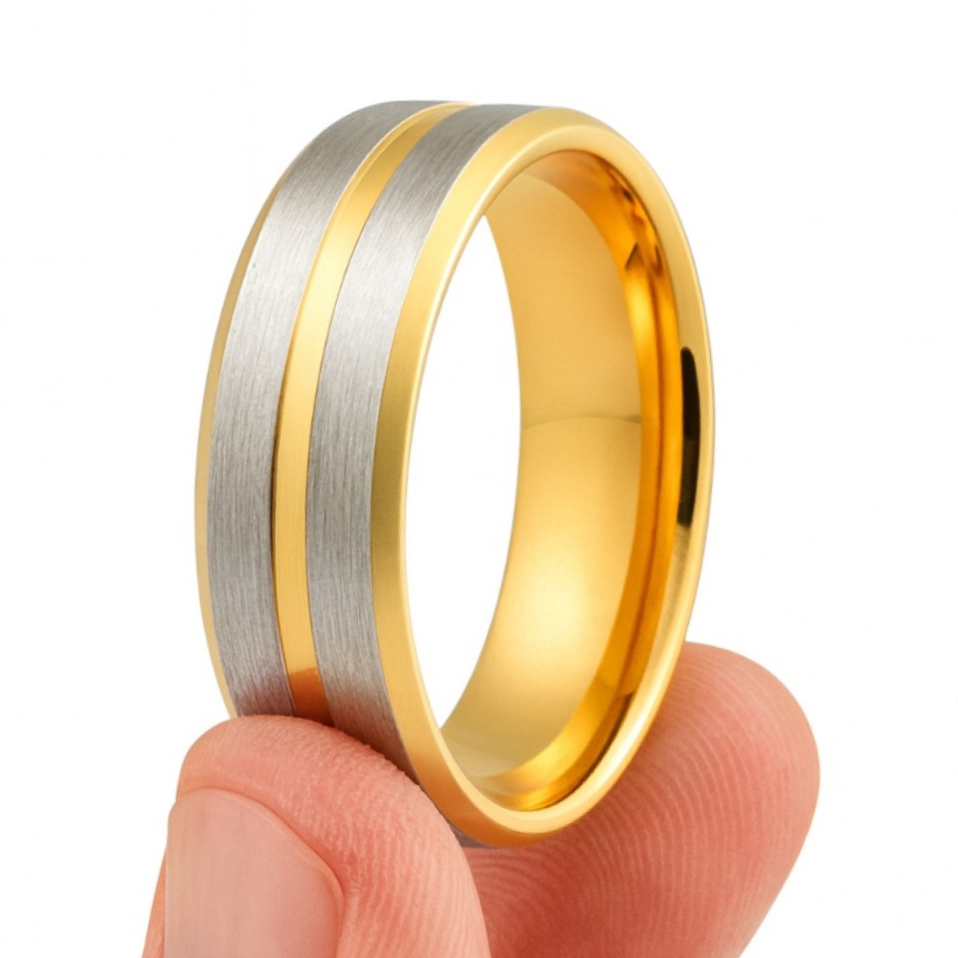 Modern men’s wedding band crafted in durable 316L stainless steel. Features a brushed silver finish with a polished gold stripe and shiny gold beveled edges for a sleek two-tone look. Hypoallergenic, tarnish-free, and comfort fit for all-day wear. Perfect as a wedding ring, promise band, or stylish everyday accessory.