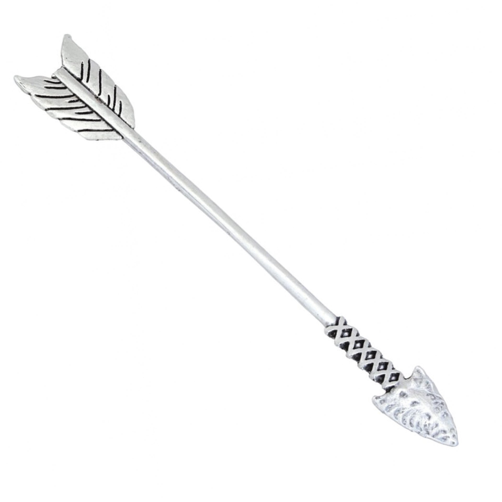 6” silver arrow hair stick pin, metal hair accessory perfect for buns, updos, and braids. Lightweight yet sturdy design with feather and arrowhead detailing. Adds a boho, festival, or vintage vibe to everyday wear, cosplay, or special occasions.