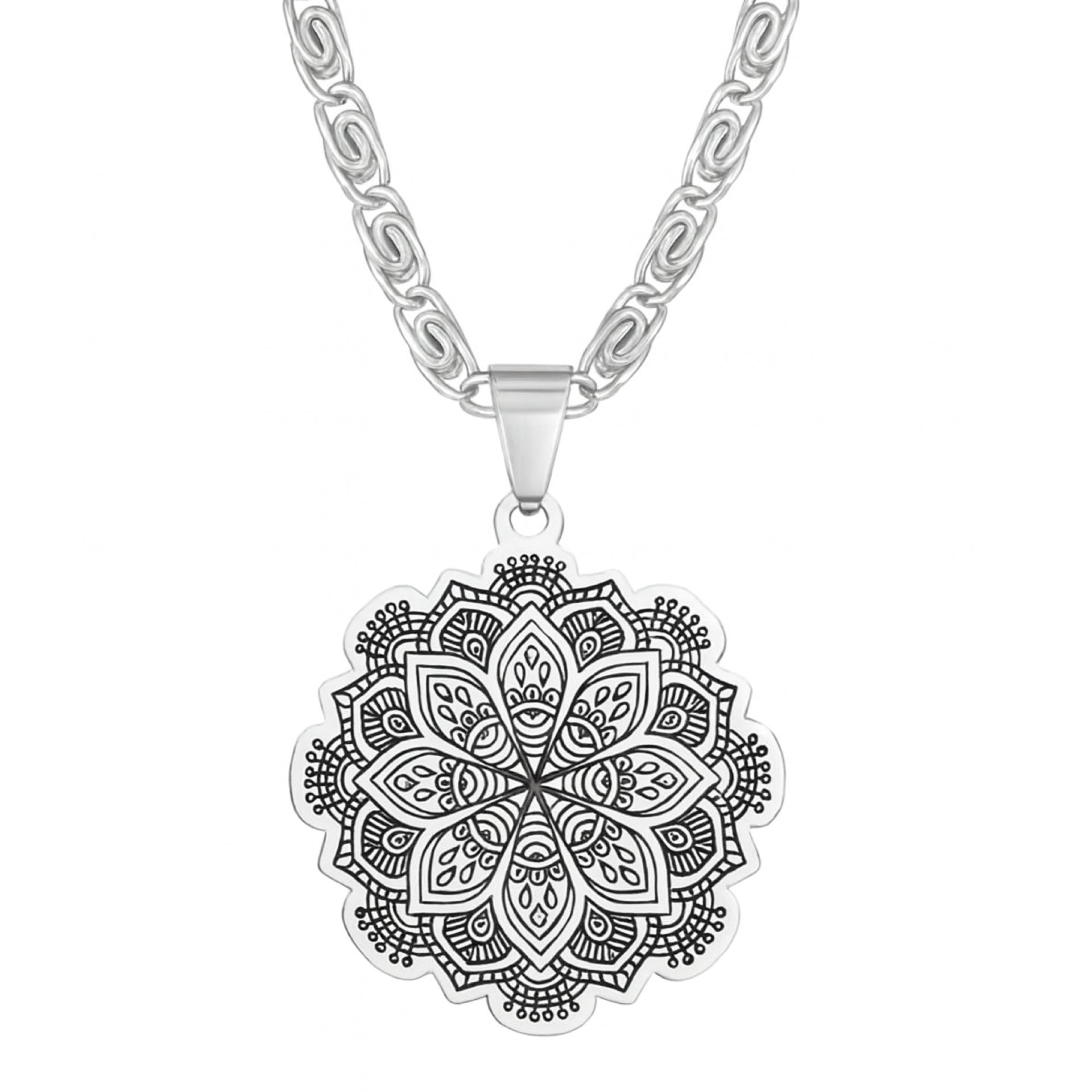 Stainless steel 1.5” mandala pendant necklace on a 20” Byzantine chain. Features an intricate lotus mandala design with a bold, detailed chain style. Hypoallergenic and tarnish-resistant, perfect for yoga, meditation, festival, hippie, boho, and spiritual looks.