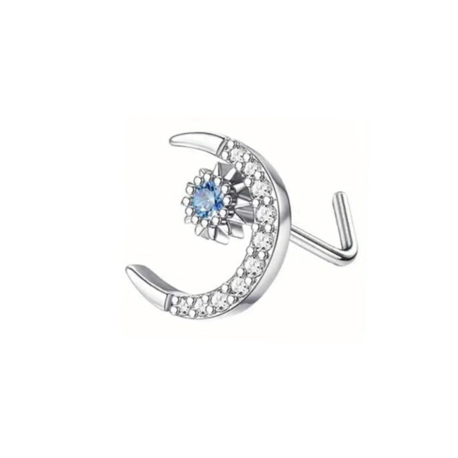Shimmering 20G crescent moon nose stud featuring a sparkling silver finish, clear CZ accents, and a radiant blue gemstone center. Hypoallergenic stainless steel design for lasting comfort and shine. Perfect for nostril piercings, adding celestial vibes.