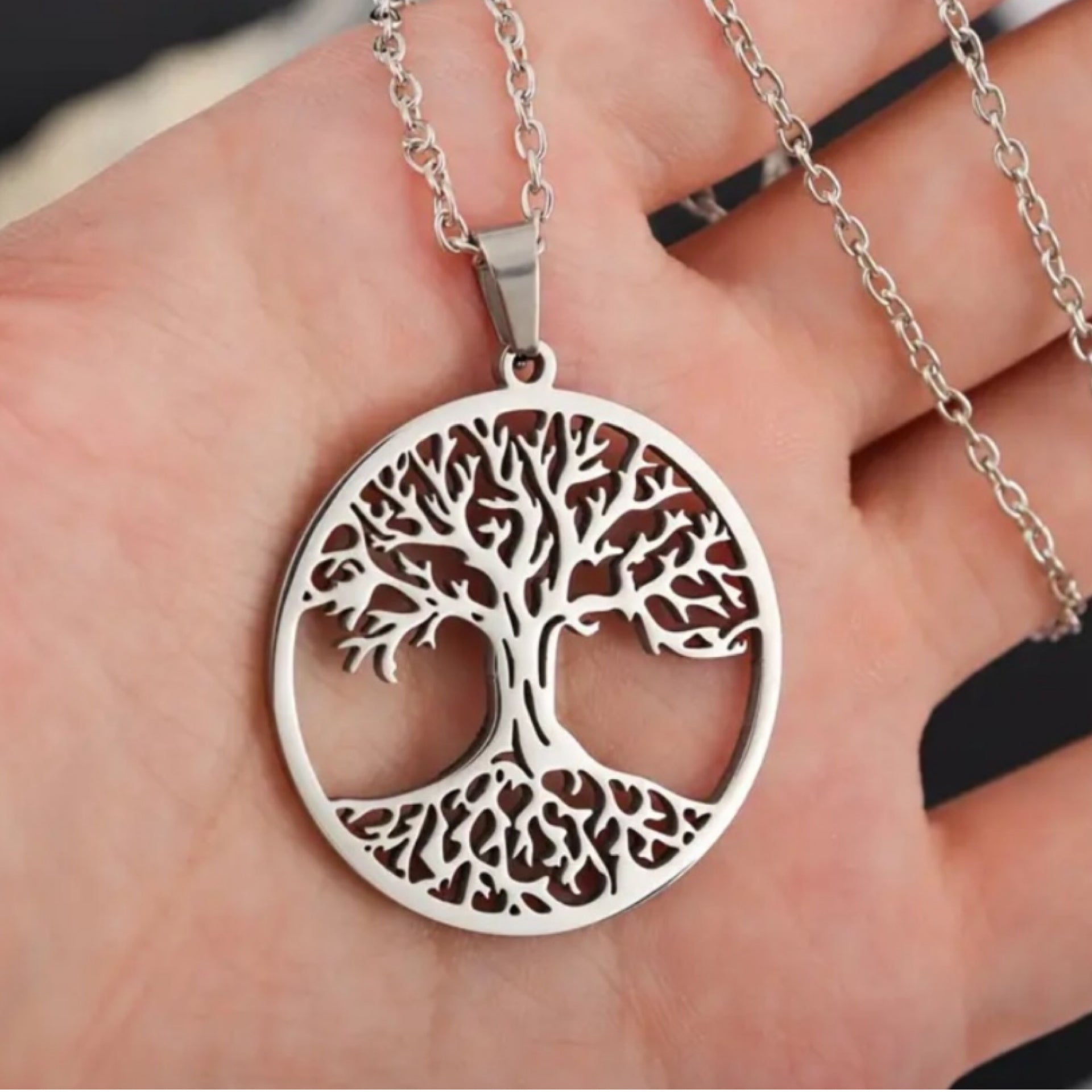 Elegant stainless steel 1.5” Tree of Life pendant necklace. Features intricate cutout design on a durable 20” chain. Spiritual, symbolic, and lightweight, perfect for everyday wear or gifting. Hypoallergenic, tarnish-resistant, and timeless accessory.