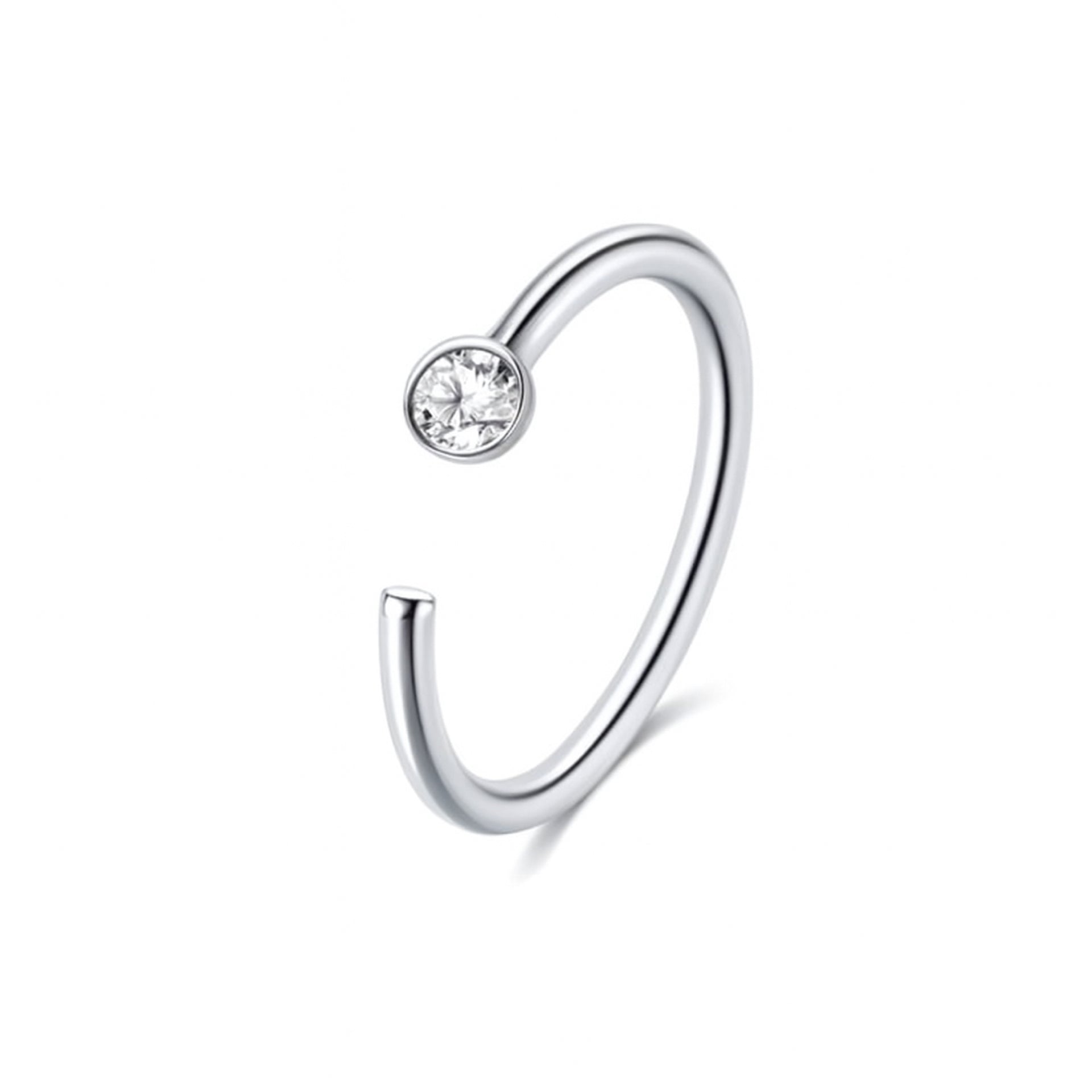 Trendy 20G stainless steel open hoop nose ring with clear cubic zirconia accent. Hypoallergenic, durable, and easy to wear for everyday style.