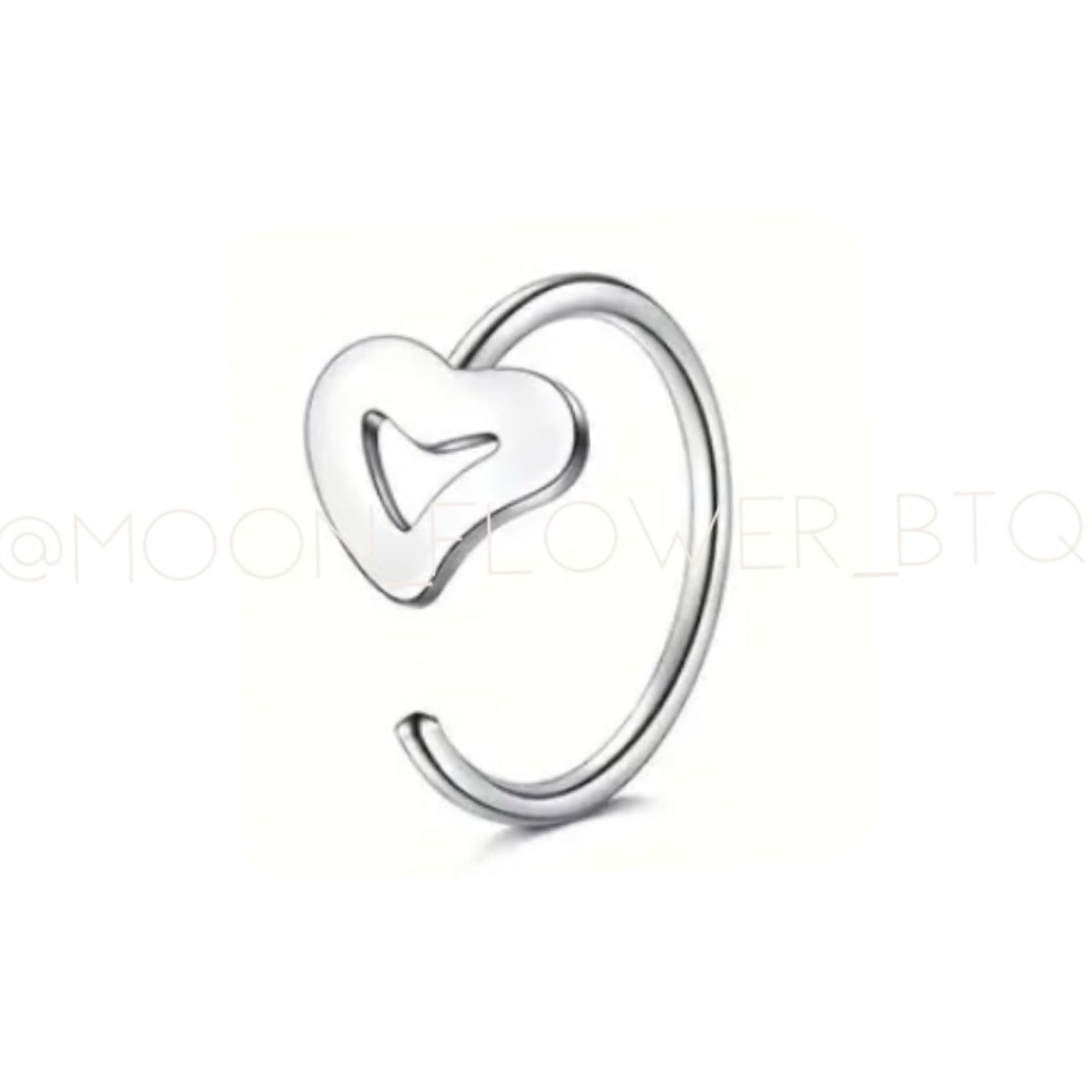 Cute silver heart nose hoop ring in 20G stainless steel. Features an open hoop with a cutout heart design for easy wear. Hypoallergenic, durable, and versatile – perfect as a nostril hoop or cartilage earring. Stylish everyday body jewelry with a sleek silver finish.