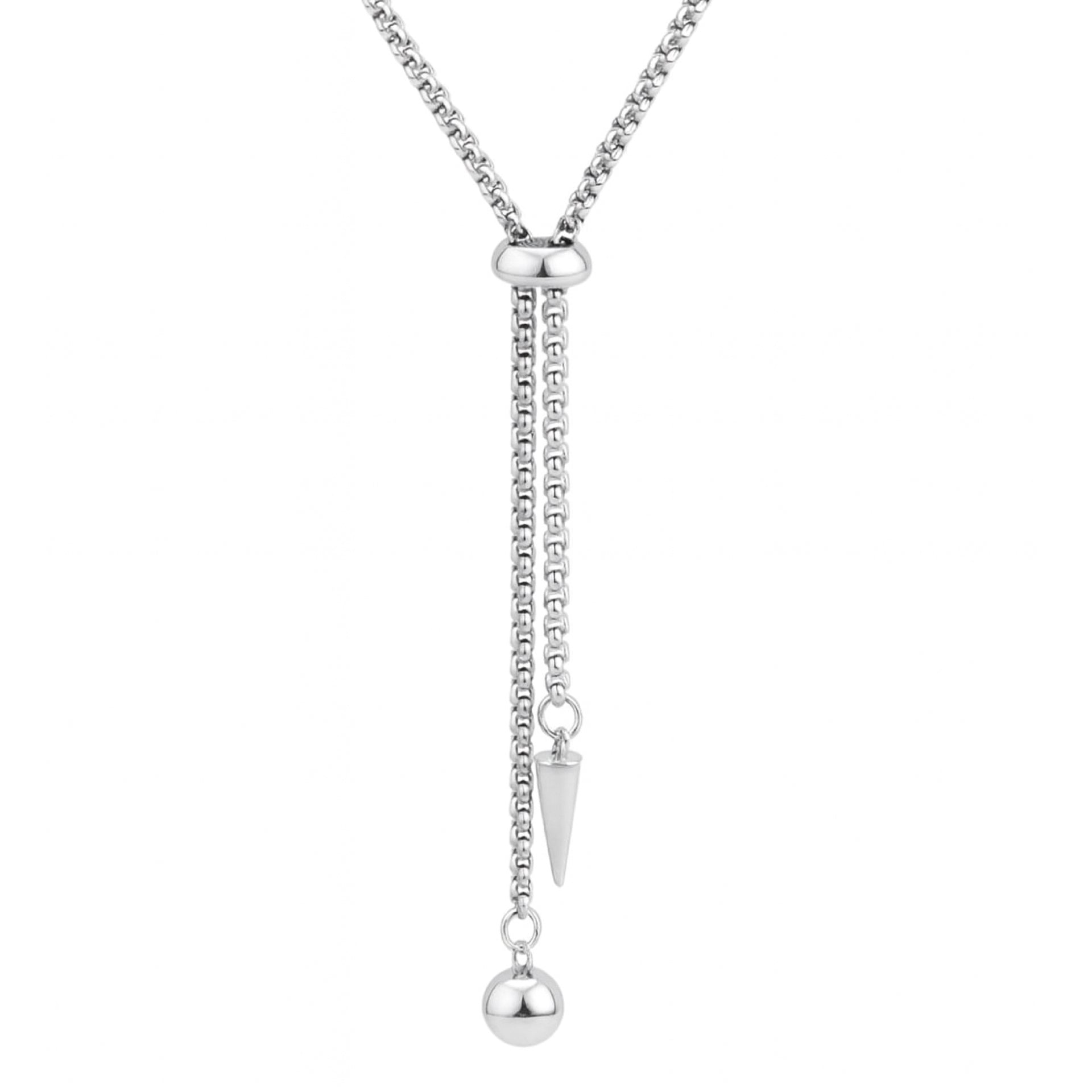 Modern titanium bolo necklace with 27” adjustable box chain and sliding bead closure, accented by a bold spike and polished ball pendant. Durable, hypoallergenic, and tarnish-resistant titanium makes it perfect for daily wear. A versatile Y lariat necklace that layers beautifully with other chains, styled for minimalist, boho, Y2K, punk, alt, festival, and everyday looks.